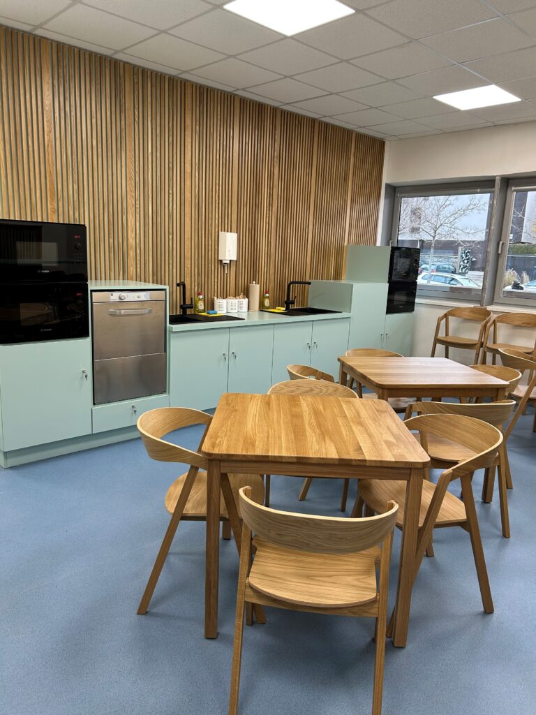 Horský sdílel své nadšení z nového moderního prostoru. „Šli jsme i do ekologie,“ popisuje vybavení kuchyňky, a sice dřevěné příbory a papírové utěrky. Skutečnou vymožeností je však rychlomyčka. „Její ovládání zvládne úplně kdokoliv, není na tom, co zkazit,“ ujišťuje Tomáš Horský. Díky tomuto modernímu stroji si studenti umyjí nádobí za neuvěřitelné 3 až 4 minuty, což je velký posun v komfortu.